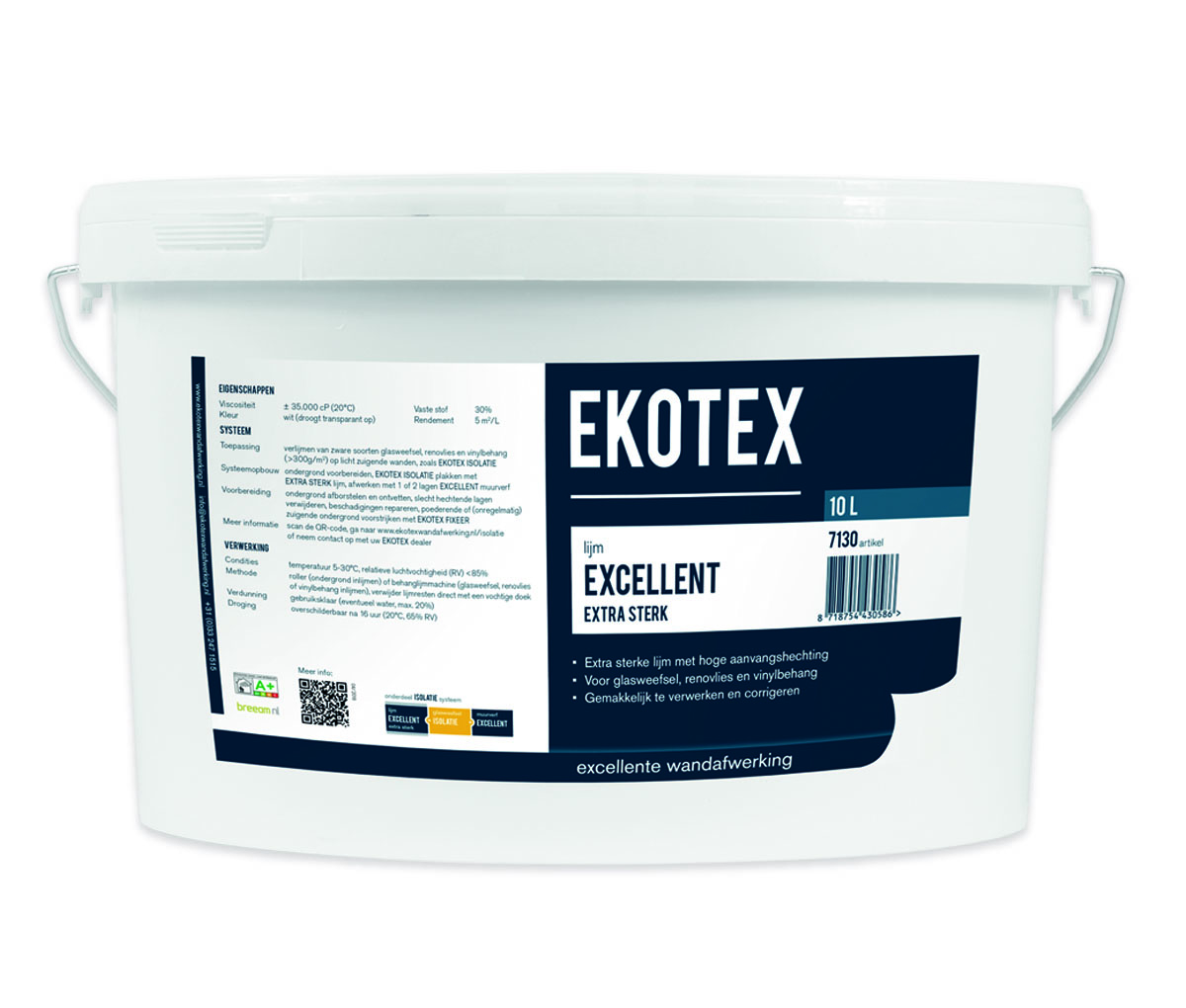 Ekotex excellent glasweefsel behang lijm extra sterk. Ideaal voor grote en kleine klussen mogelijk met lijmbak. De lijm is goed te combineren met het excellent gaasweefsel behang en duurzame verf. Er is ook een extra sterke variant beschikbaar. Deze emmer bevat 10 liter lijm extra sterk en is gebruiksklaar.